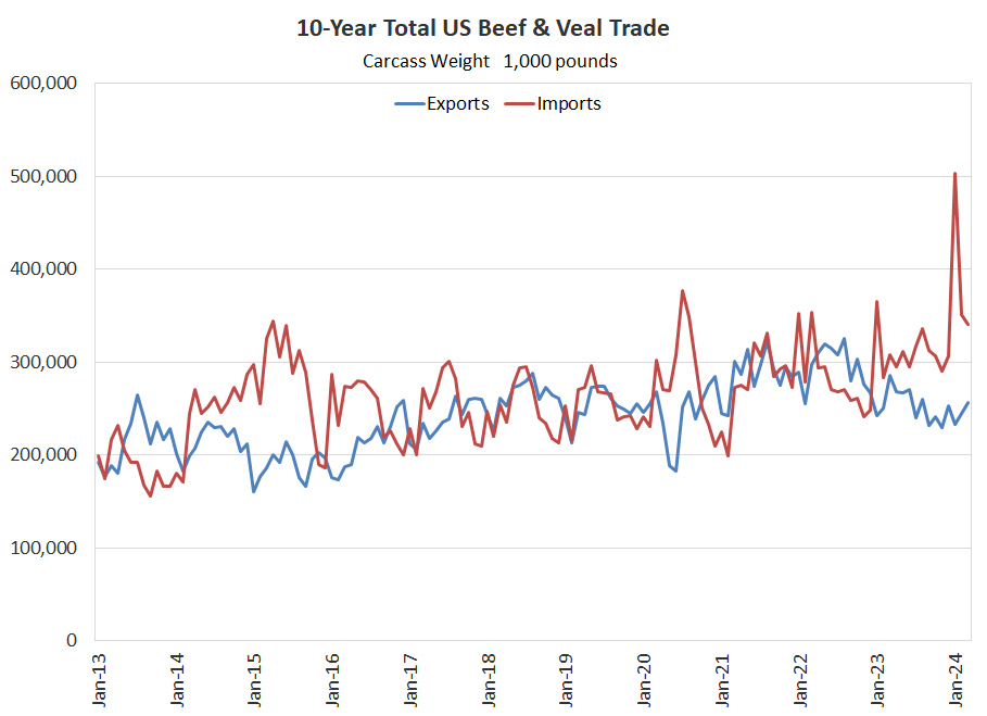 US beef and veal exports increased +4.9% for March, however fell -10.4% from year-ago levels and are -5.9% compared to last YTD. The top three destinations for US beef & veal in 2024 have been Mexico, South Korea and China (Taiwan). Beef and veal to Mexico rose +7.8% from last reported however are -5.1% under a year earlier, while those to South Korea jumped +23.6% in March though are -13.7% under the same month in 2023, and China (Taiwan) increased +3.8% on the month but is -7.5% compared to last year. Beef and veal imports for the same period fell -3.0% on the month however were up +10.6% over a year earlier. Year-to-date imports are up +25.0% compared to the same months in 2023. The top three countries for 2024 that supply beef and veal to the US are Canada, Brazil & Australia. Imports from Canada increased +16.7% in March and are up +20.2% from a year earlier. Beef and veal imports from Brazil dropped -40.1% from February levels and are -26.6% under March 2023, while Australia fell -7.9% on the month however is +117.2% over last year.